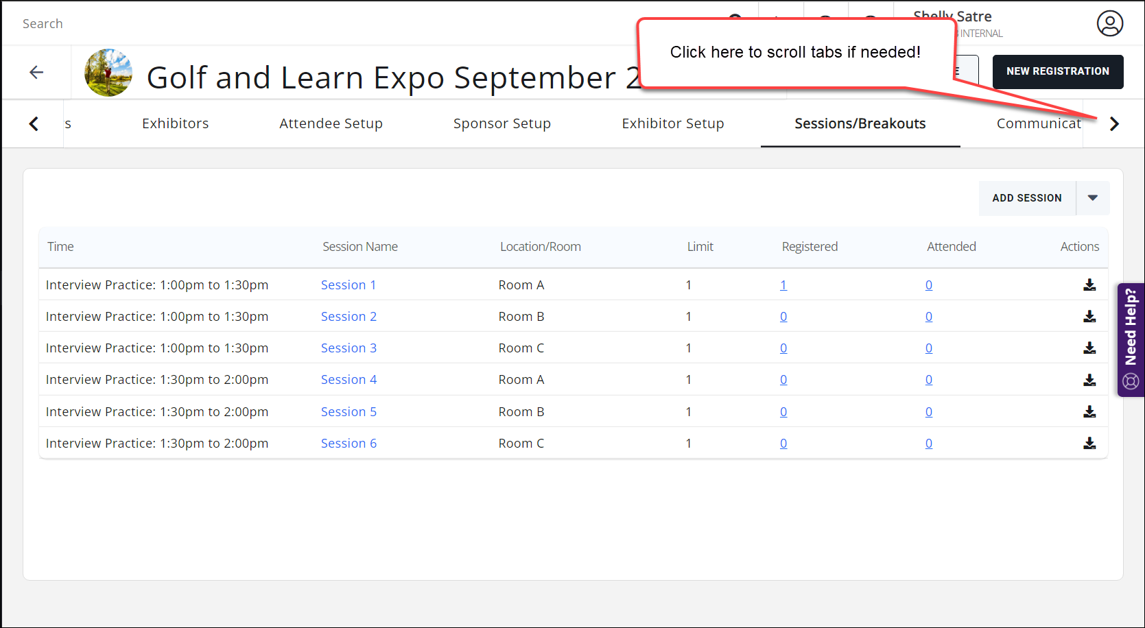 For the desired event, click the Sessions/Breakouts tab.