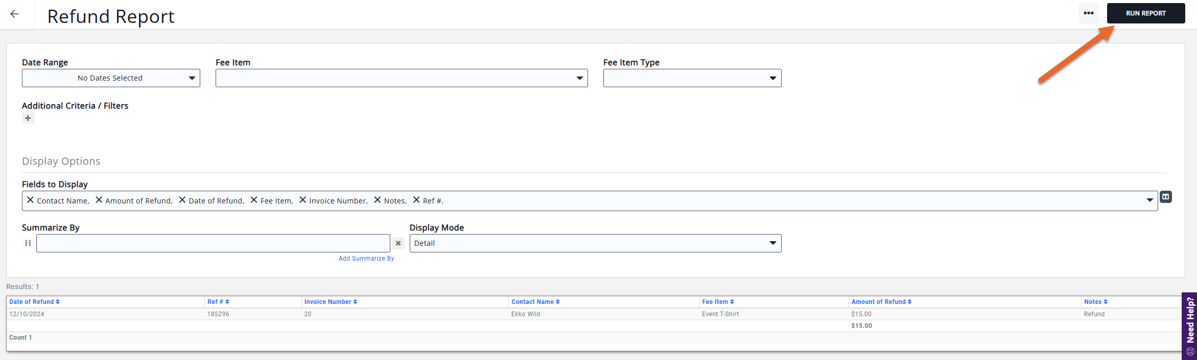 The Refund Report will generate a report of all refunds you have performed over a given date range. You can generate the report to display specific Saleable Items (Goods/Services), Saleable Item Type, and/or apply additional filter criteria. By default the report will display: Amount of Refund, Contact, Date of Refund, Goods/Service and Reference #.