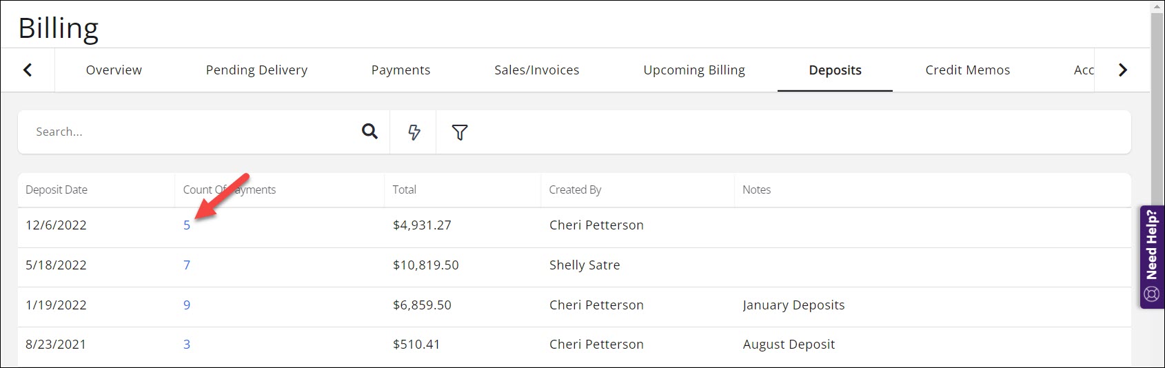 - Click the hyper-link in the Count of Payments column to view the payments associated with the deposit.