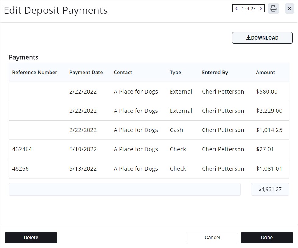 You may view previous deposits, and the payments associated to those deposits on the Billing module Deposits tab. From this tab, you would also be able to download a list of the payments that make up the deposit.