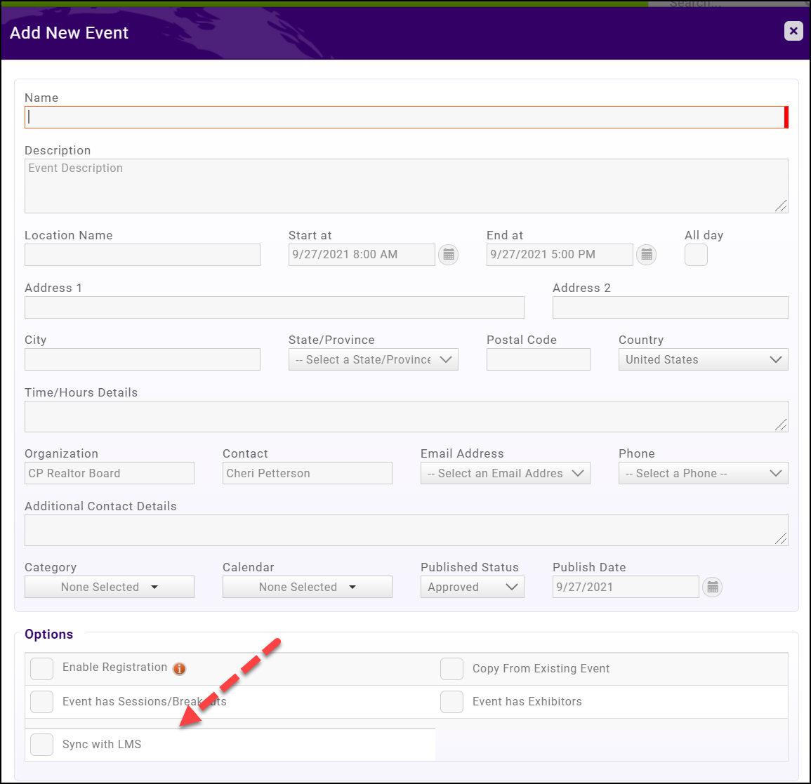 When setting up an event, if you wish to sync the event to Path LMS you will enable the "Sync with LMS" function when adding an event in the Options section.