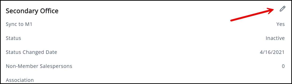 Changes can be made to existing office supplemental records. You cannot change the OfficeID/AssociationID. You would need to inactivate the record and add a new one. Only the POE who added the office supplemental record can change it. When Sync With M1 is checked, on the Real Estate tab, any changes made to the fields listed Data Sent to M1 for Secondary Office will trigger a change transaction. All fields will be sent, not just those that you have changed.