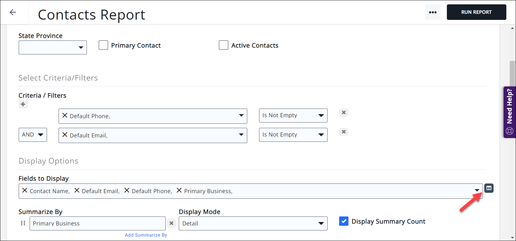 To change the order in which fields are displayed in your report select the icon in the Display Options section.