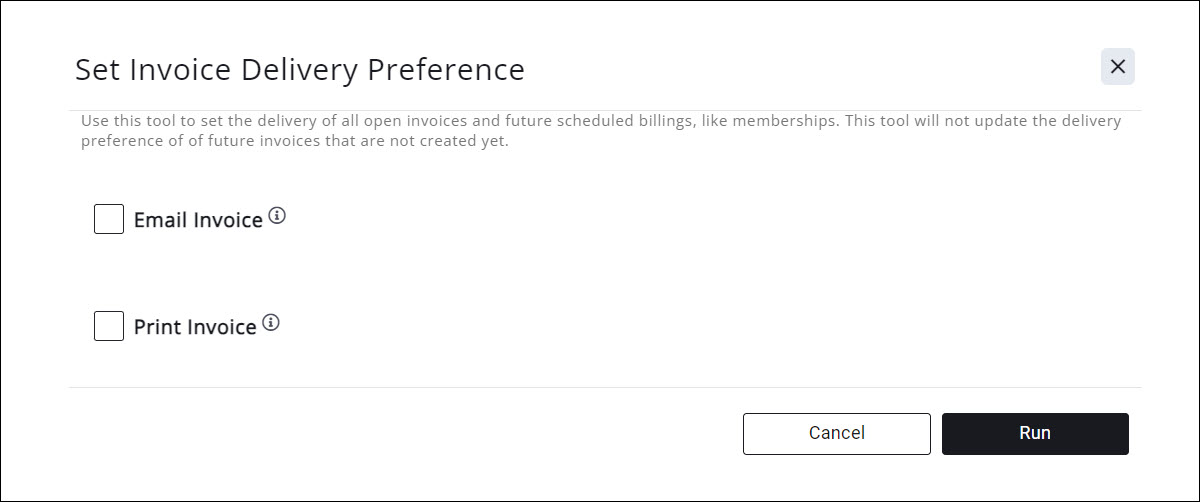 When invoices are created, the delivery preference is defaulted to Email. The Set Billing Email and Print Flags tool allows you to set or unset the email/print checkbox on ALL active Scheduled Billing records, as well as on ALL open invoices.