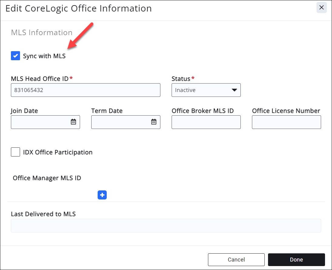 If Sync with MLS is enabled for the office, a change to any of the information listed in Data Sent to Corelogic-Matrix for Offices will automatically be sent to Corelogic Matrix.