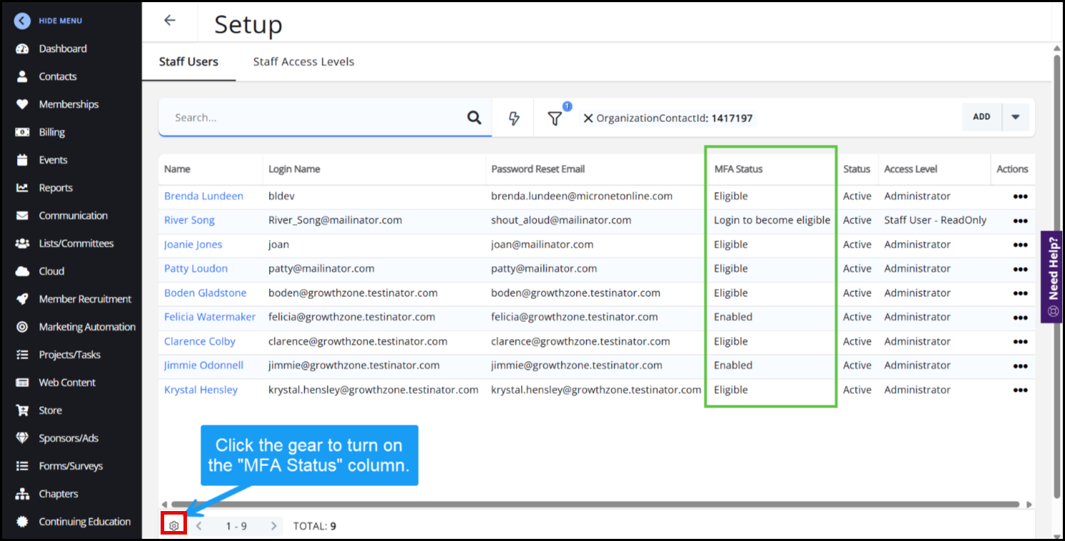 A column under Setup, Staff Setup will now indicate whether a staff person 1) has enabled MFA, 2) is eligible for MFA, 3) is not eligible, or 4) needs to log in to become eligible. Visibility into MFA status for each staff person will help staff administrators assist their own staff within their association to identify who needs encouragement to enable MFA and troubleshoot issues. All customers have this optional column available.
