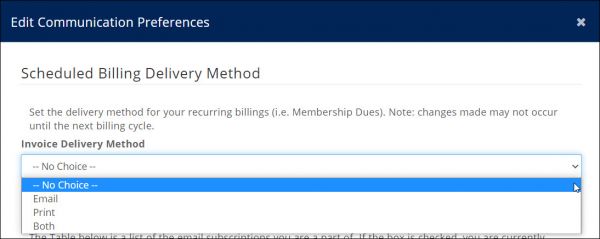 - In the Edit Communication Preferences window, select from the options (Email/Print/Both) in the Invoice Delivery Method dropdown.