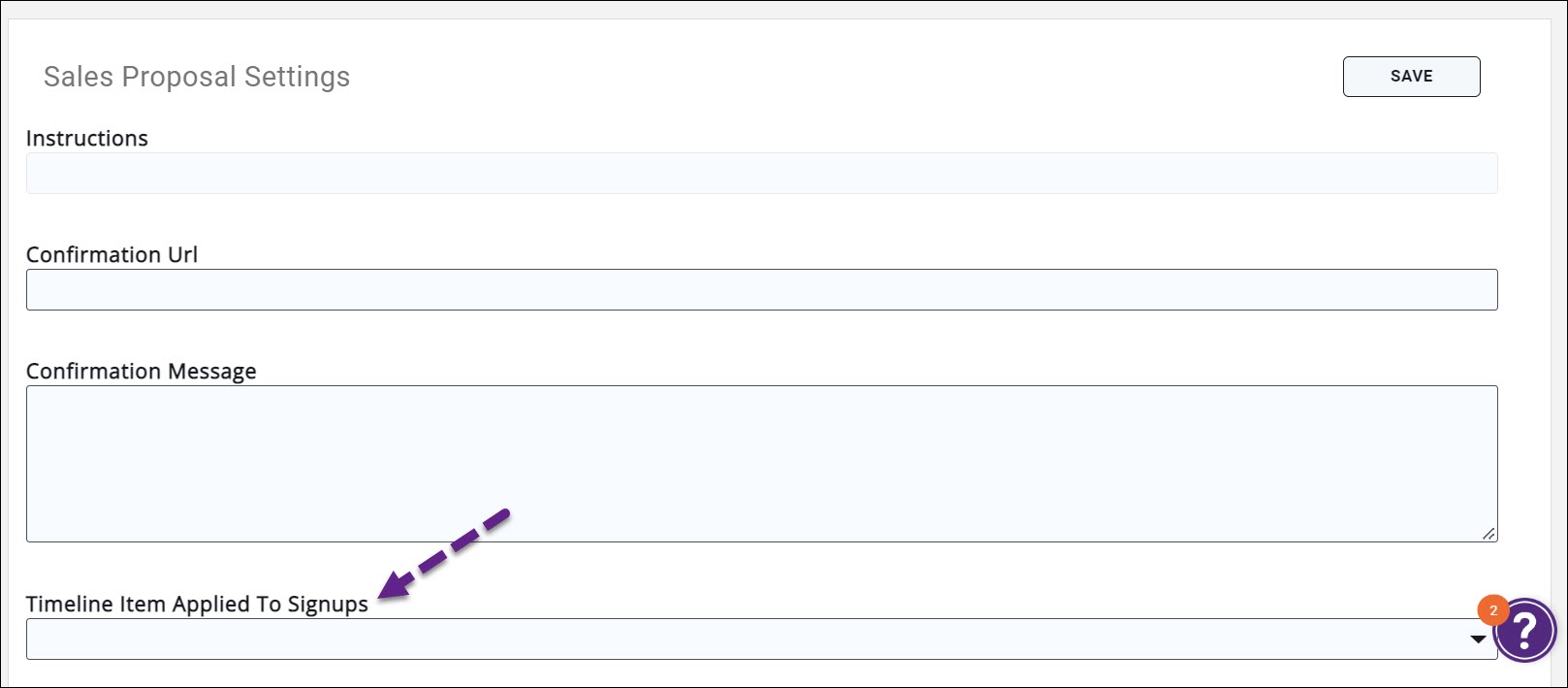 Timeline Item Applied To Signups January 29, 2026 13:07 Updated Click Setup Click Sales Proposal Settings in the Sales Funnel section Select the Timeline Item Applied To Signups from the drop-down list Click Svae to save your changes
