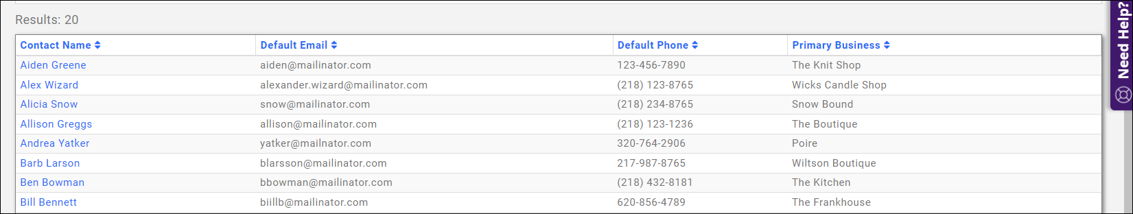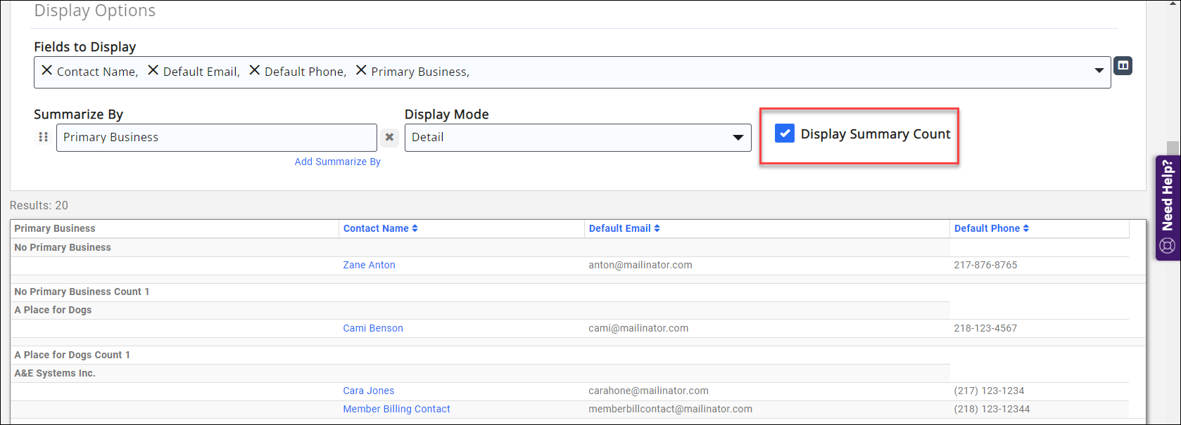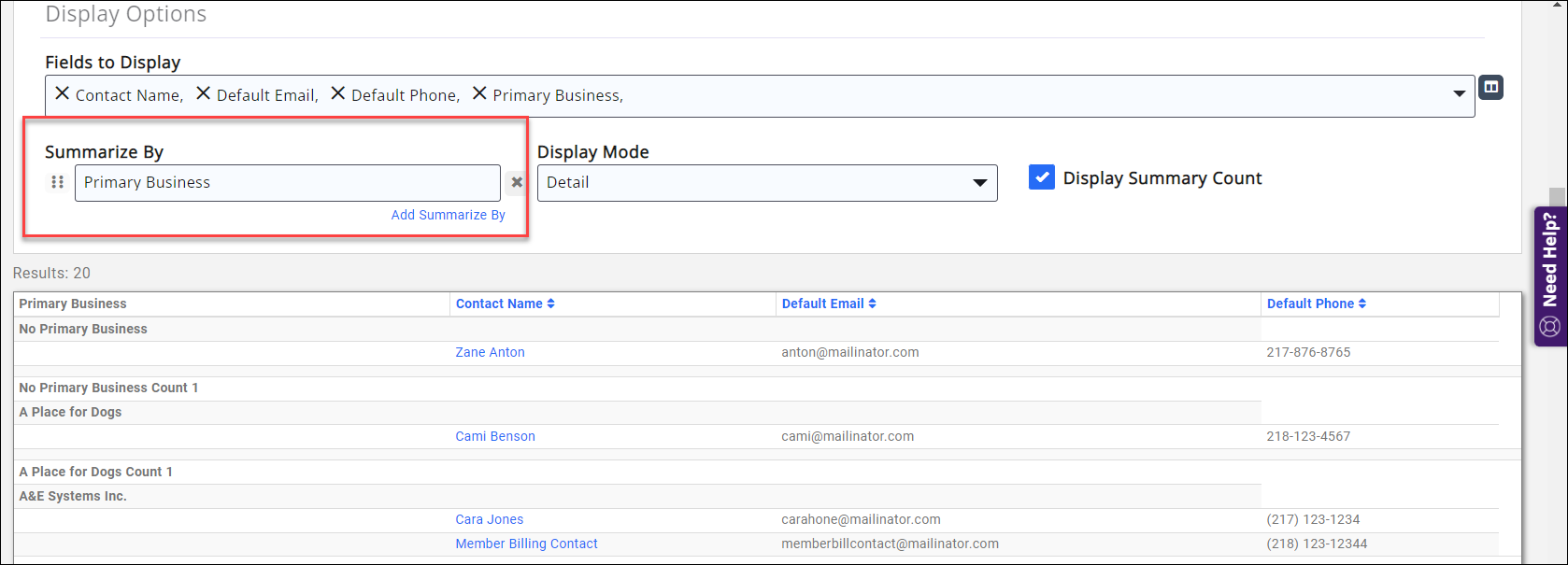 If we wished to see which contacts belonged to which primary business, we could use the "Summary By" option to group the contacts by their primary business: