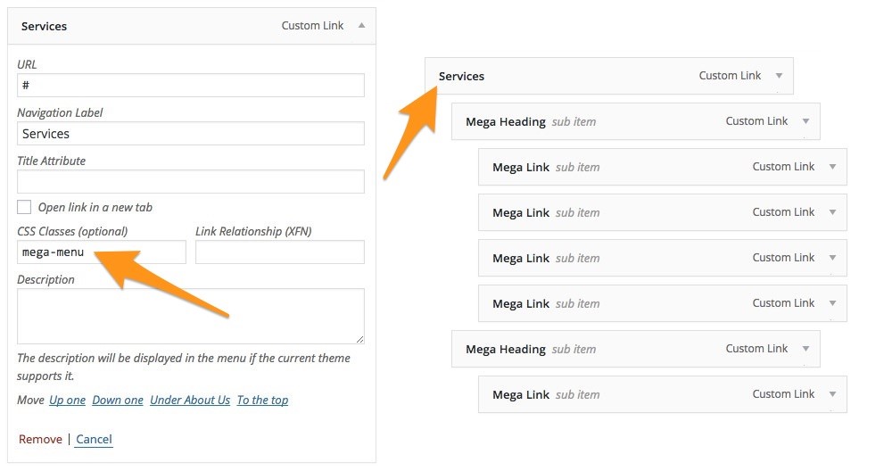 In the CSS Classes field, enter mega-menu, as shown in the screenshot. (If you don’t see this field, in the upper right corner, click Screen Options and make sure the CSS Classes checkbox is selected.)