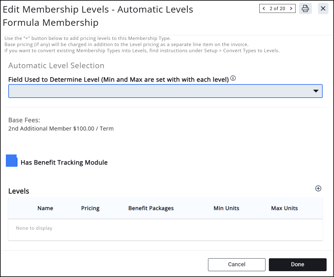 - Select the field to determine the level assignment from the Field Used to Determine Level (Min and Max are set with each level) list. Fields displayed are those you have selected for your variable dues formula. No option will be displayed if you have not completed step 6.