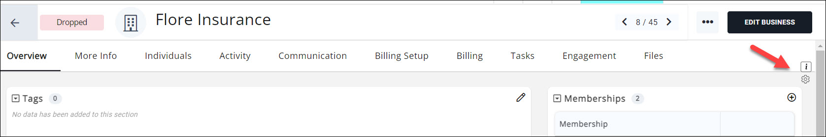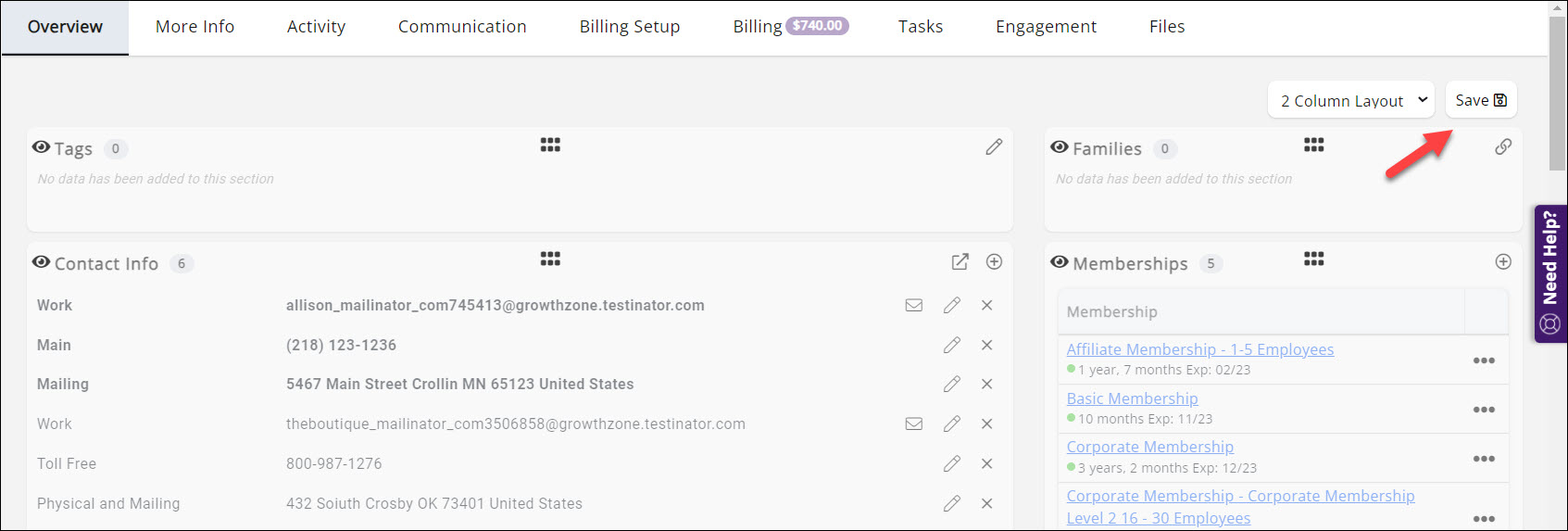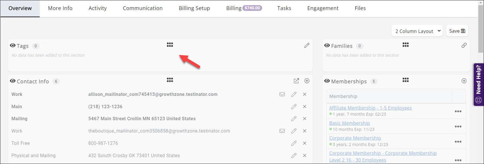 The contact's Overview tab can be customized to suit your needs. Changes that you make will be for you only, each staff member can have their own view. You will be able to change the number of columns and rearrange the sections.