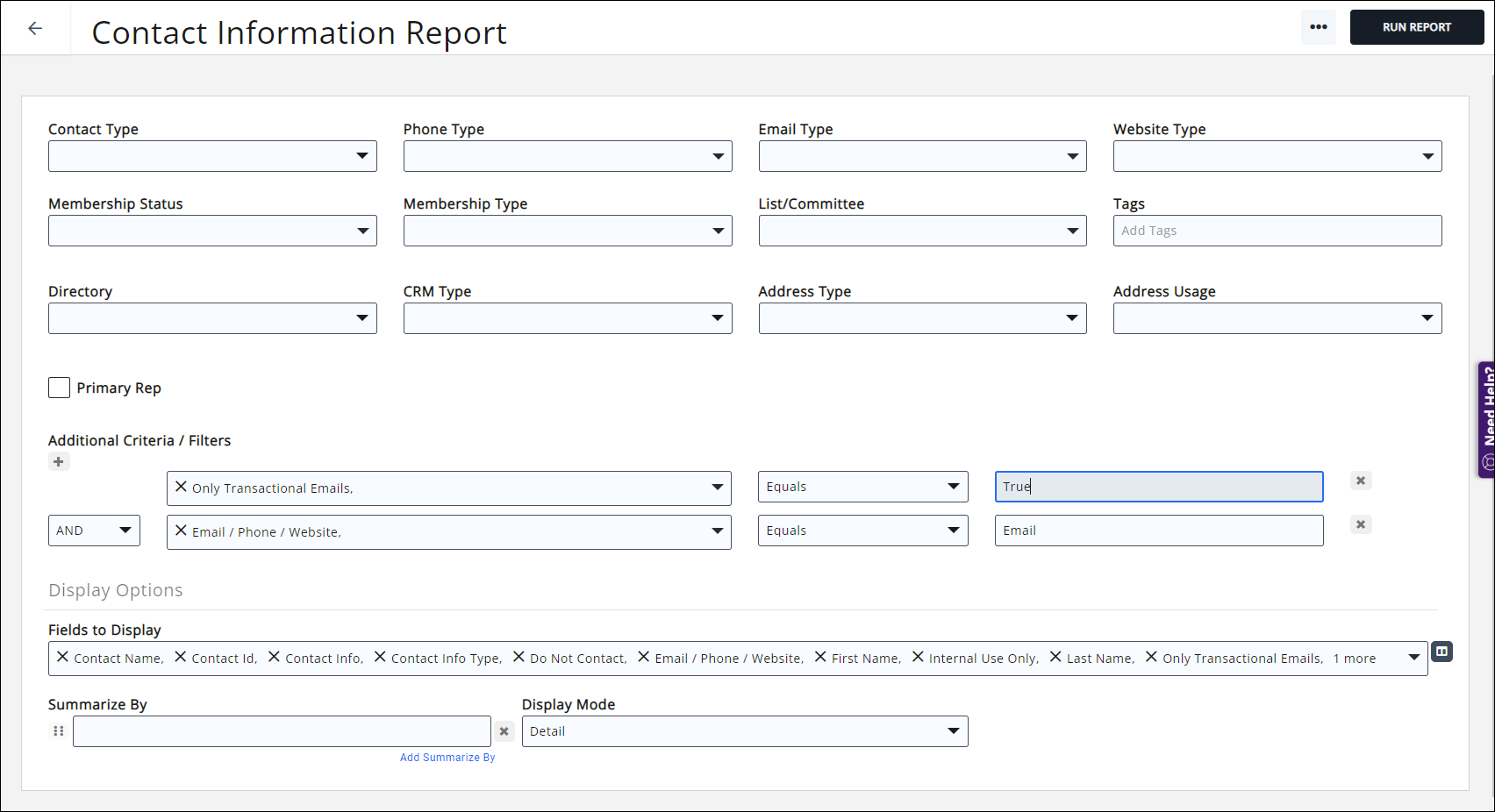 Contact Information Report Example: Identify contacts whose emails are marked as Transactional Only January 29, 2026 12:39 Updated Only Transactional Emails Equals True AND Email/Phone/Website Equals Email. See the following for Common Report Functions: Export Reports Email Reports Add Report Contacts to a List/Committee Mailing Labels Save a Report as a New Report Save a report as a Favorite Report Report Filtering Options