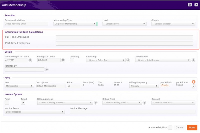 If your Membership Types are set up to calculated dues variably Information for Dues Calculation section will be displayed on the Add a Membership screen. Your staff will enter the appropriate values, and the system will calculate the additional fees based on the formula setup for the membership type.