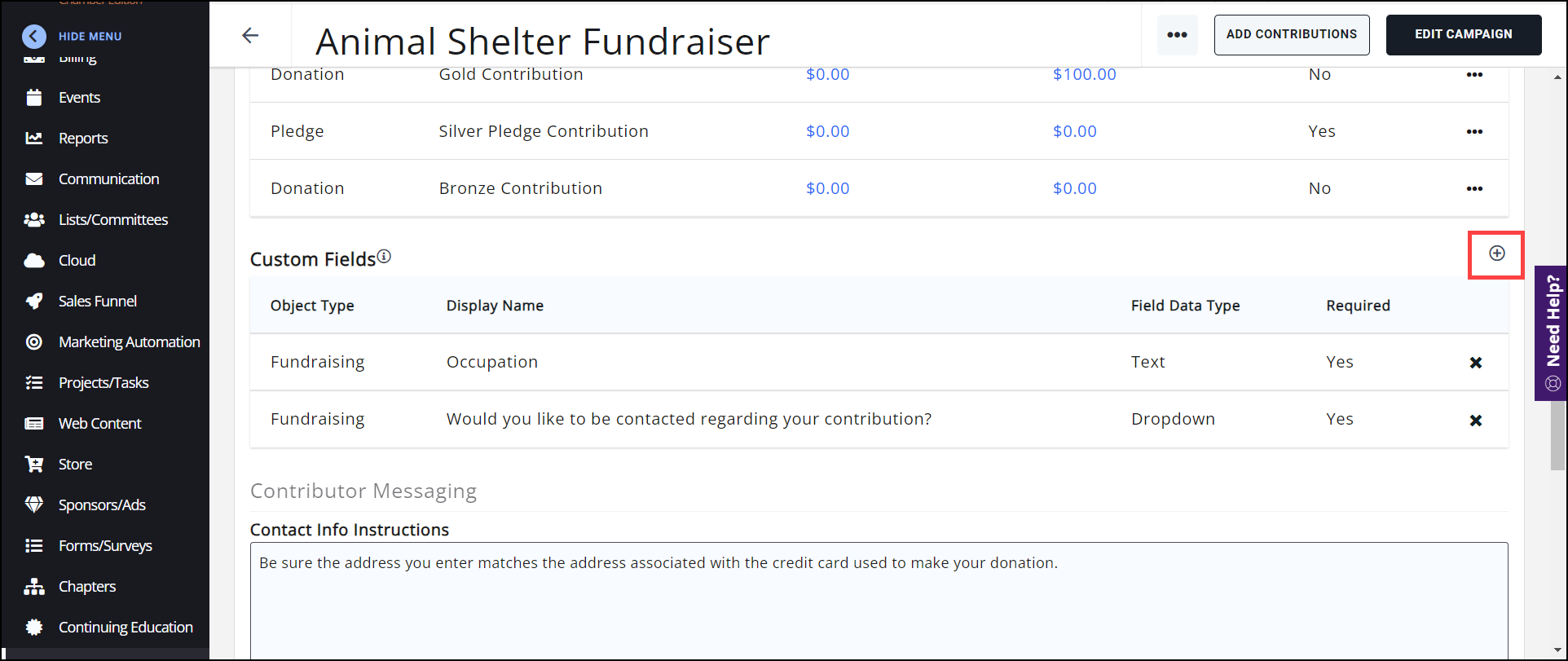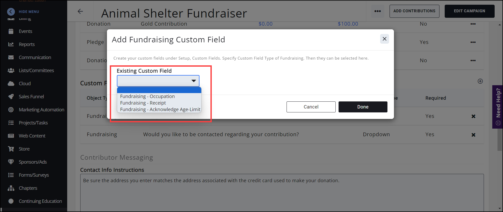 For each Fundraiser, you can add/edit the fields you wish to include on your application form. Custom Fields must be created before selection in the Fundraising module.