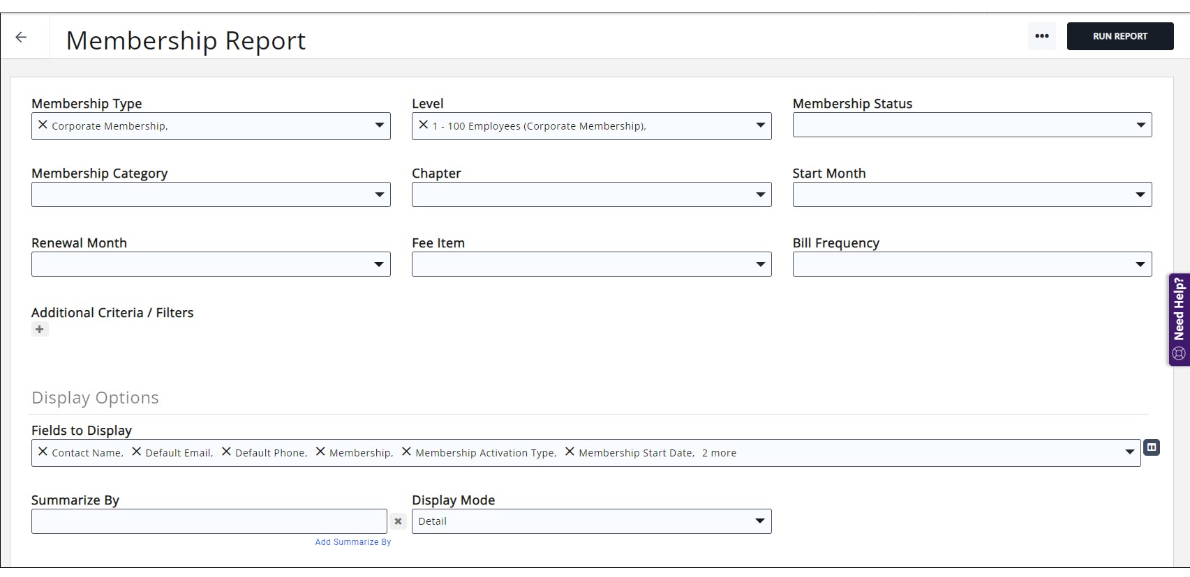The Contact Report includes the Membership Name (Type+Level+Chapter) as the default when viewing the Membership Type results. See Contacts Report.