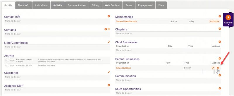 - On the Branch’s Profile tab click the orange x next to the parent agency in the Parent Organization section. The Branch status will be listed as Non-member in GrowthZone.