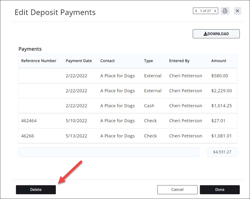 NOTE: The ability to delete a deposit is dependent on the "Allow Deletion for (days)" setting under your Finance Settings. If you are within the deletion days you will be able to delete the deposit. If you are outside of the deletion days you will not be able to delete the deposit. See Configure Finance Defaults & Logo for Invoices & Statements for further information on configuring the setting. You may also NOT delete a credit card deposit.