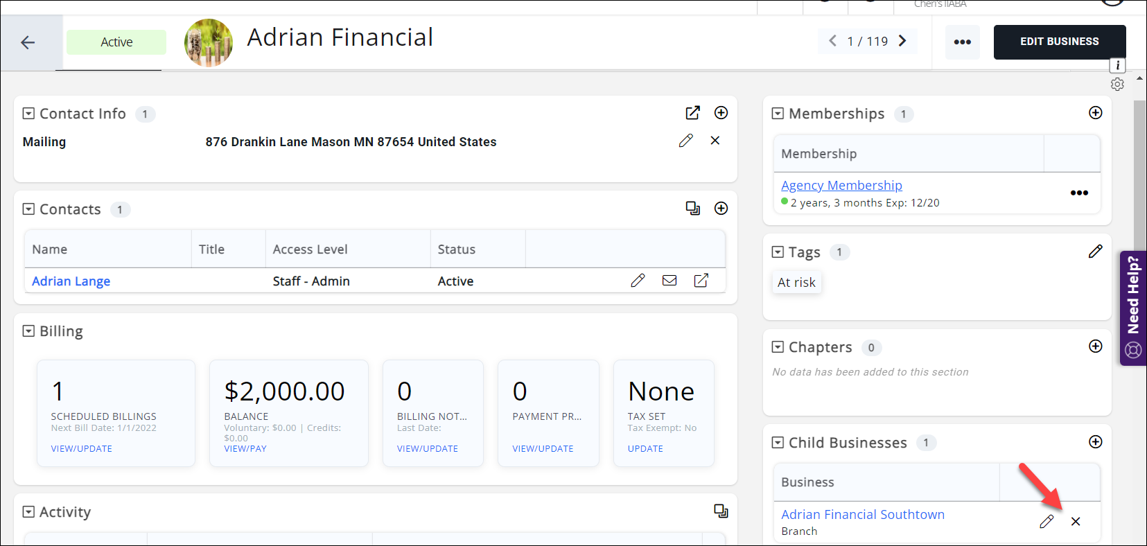 You can drop a branch from an agency membership by removing the branch from the Child Businesses list of the Parent, or by removing the Parent Business when in the Branch record.