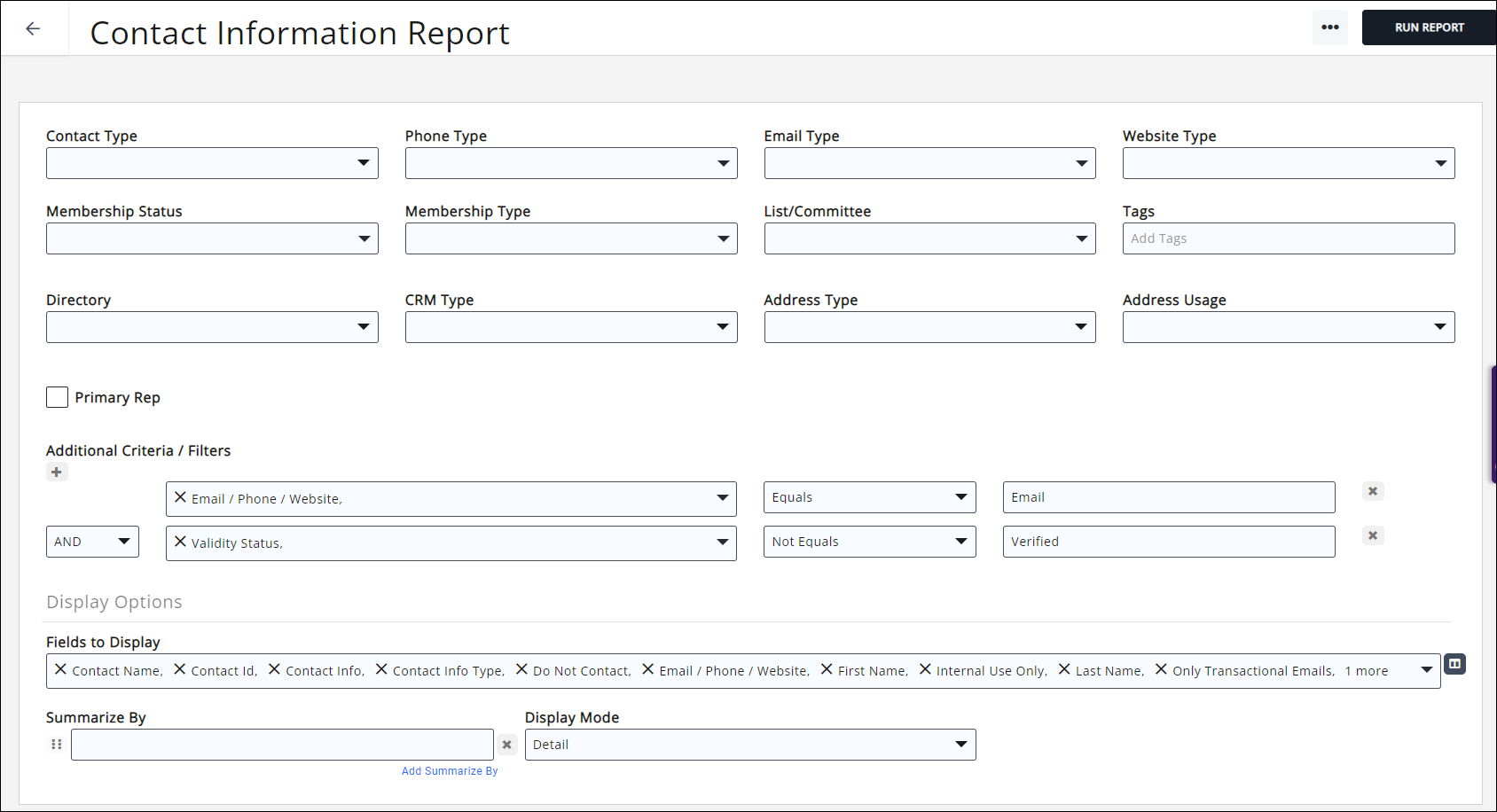 Contact Information Report Example: Identify contacts whose emails are marked invalid and the reason January 29, 2026 12:40 Updated Email/Phone/Website Equals Email AND Validity Status Not Equals Verified See the following for Common Report Functions: Export Reports Email Reports Add Report Contacts to a List/Committee Mailing Labels Save a Report as a New Report Save a report as a Favorite Report Report Filtering Options