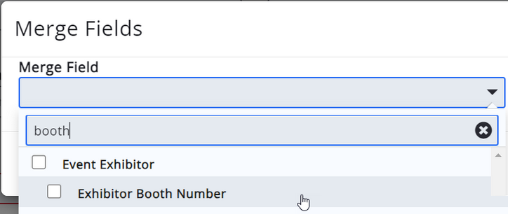 2. Exhibitor Booth # is available on the Exhibitors tab when sending emails using Send Email to Exhibitors. You can also create email templates that include Exhibitor Booth # if the template Category is Events. At this time, it is not available as a merge field when sending a one-off email to a particular exhibitor (Send Email under the Actions column on a particular Exhibitor).
