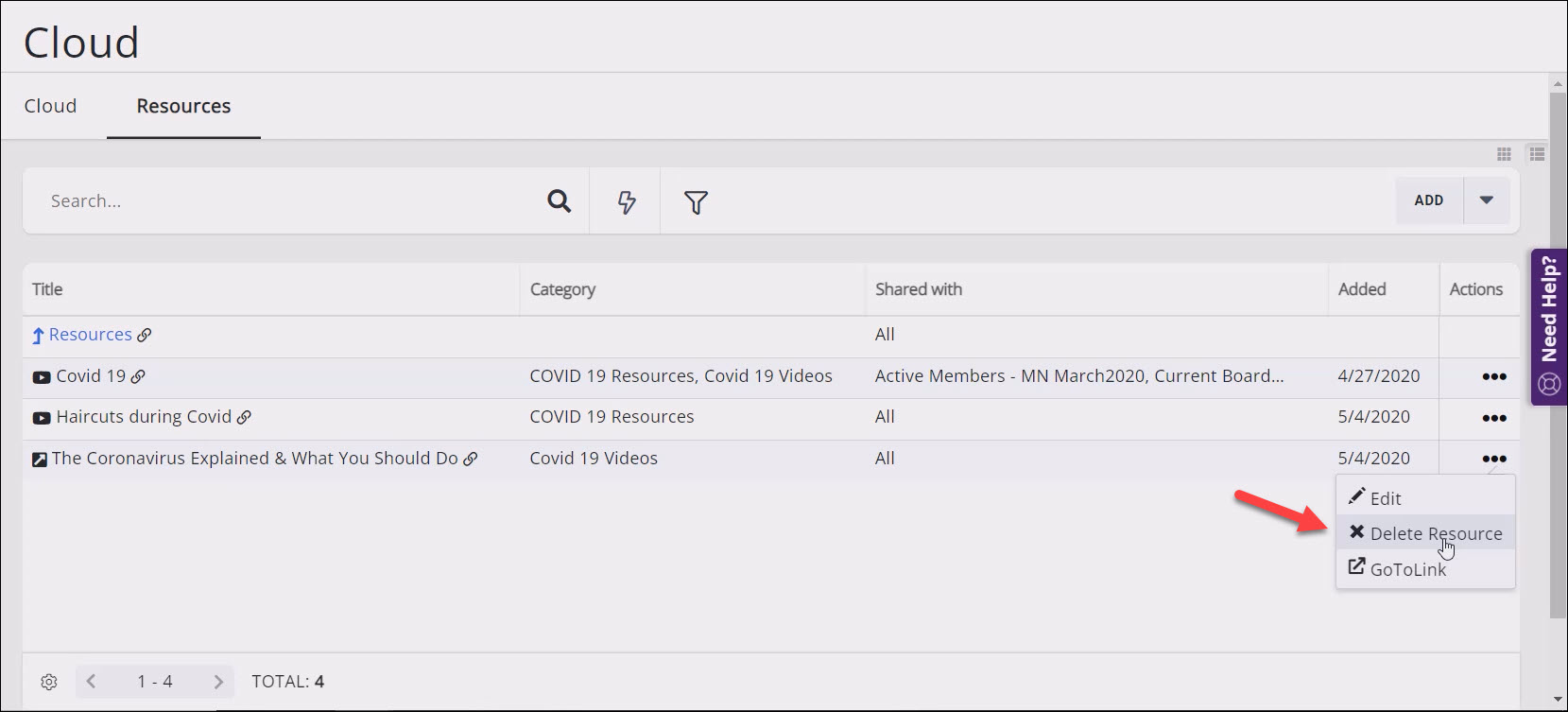 - Click the folder from which you wish to delete resources