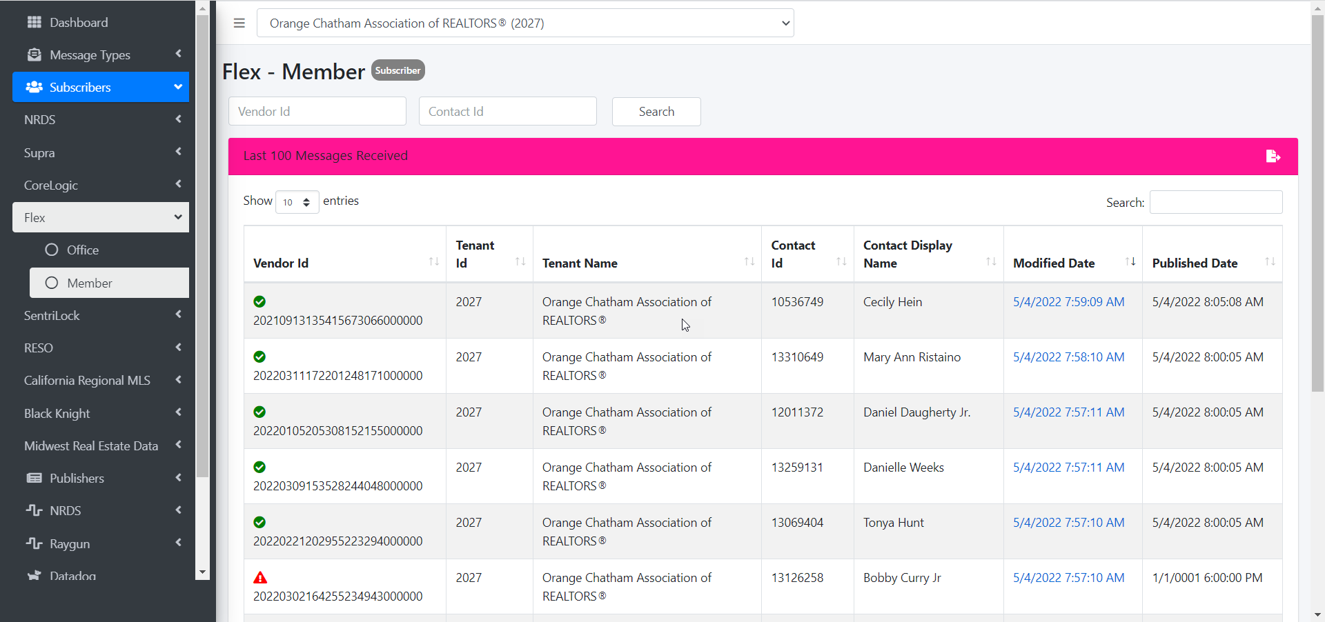 Once the desired selection is found, You can click on the Modified date to view exactly what was sent to Flex. Also, there is a green checkbox if this information was sent successfully. There is a red triangle when there was an error.