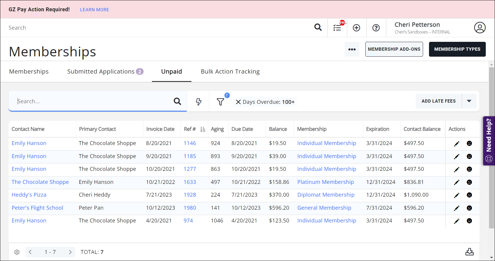 Once you have identified the unpaid invoices you can email the invoices, add late fees, suspend (Realtor only) and drop members. See Manage Unpaid Membership Dues for further information.