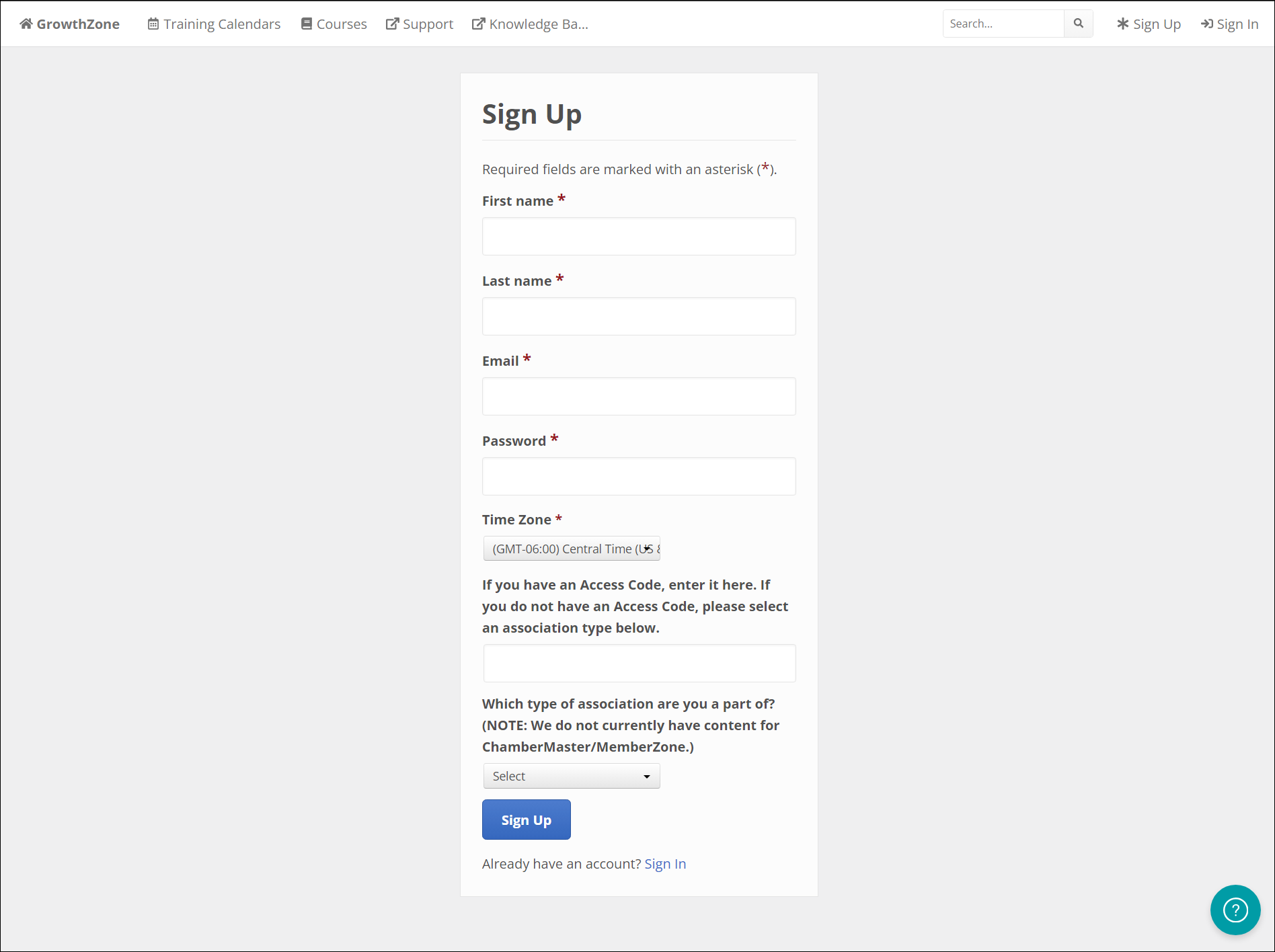 - Access Code (GZ Staff only): Only GZ Staff currently have an access code. If you are not GZ Staff, leave this empty. If you are GZ staff and need the access code, contact training@growthzone.com.