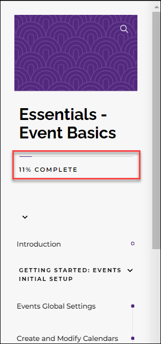 The course will track your completion and will display a percentage at the top of the left navigation pane.