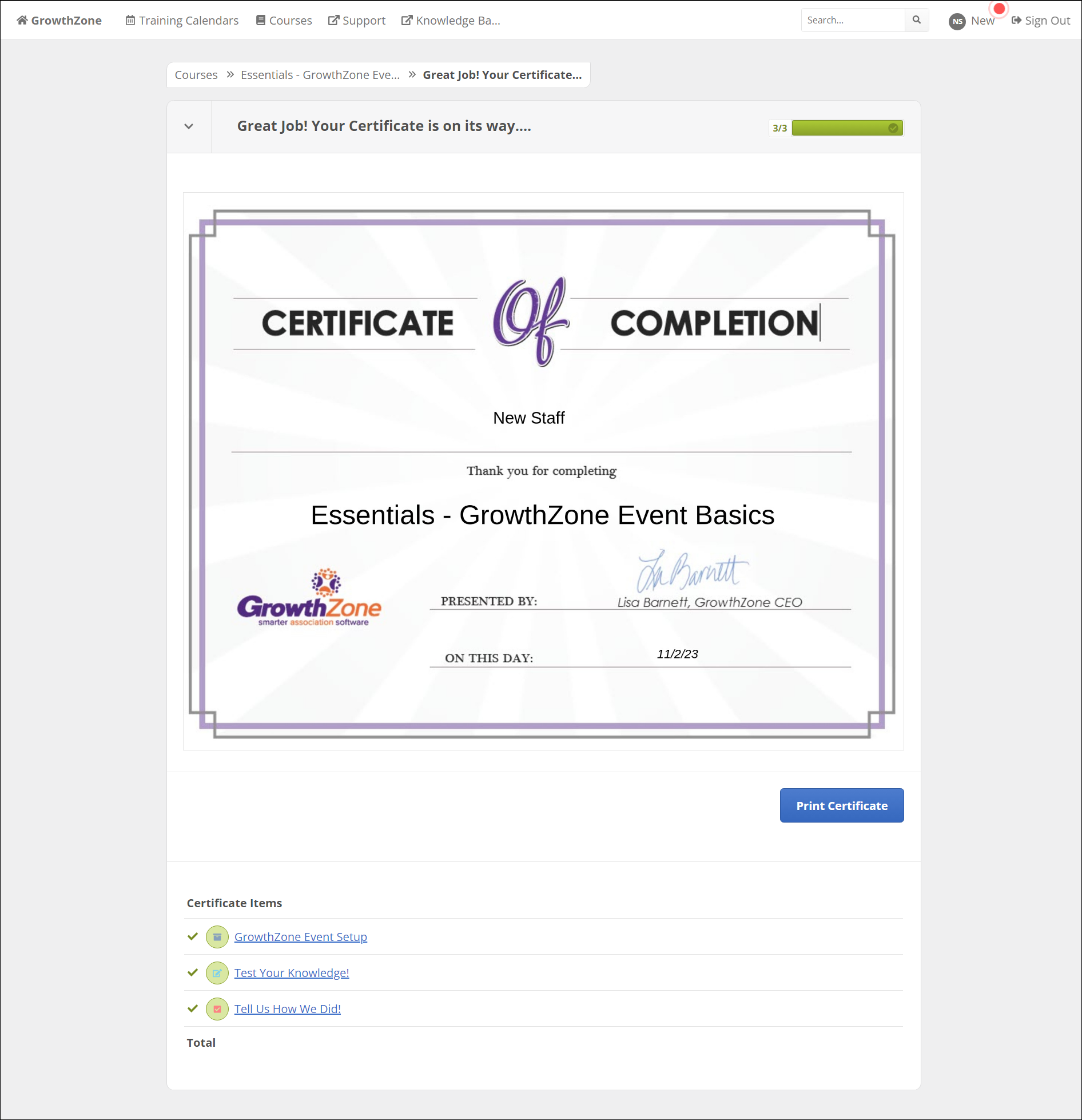 We can print our certificate or save it as a PDF. And you can also always access your certificate later by clicking your name in the upper right corner, then selecting the Certificates tab.