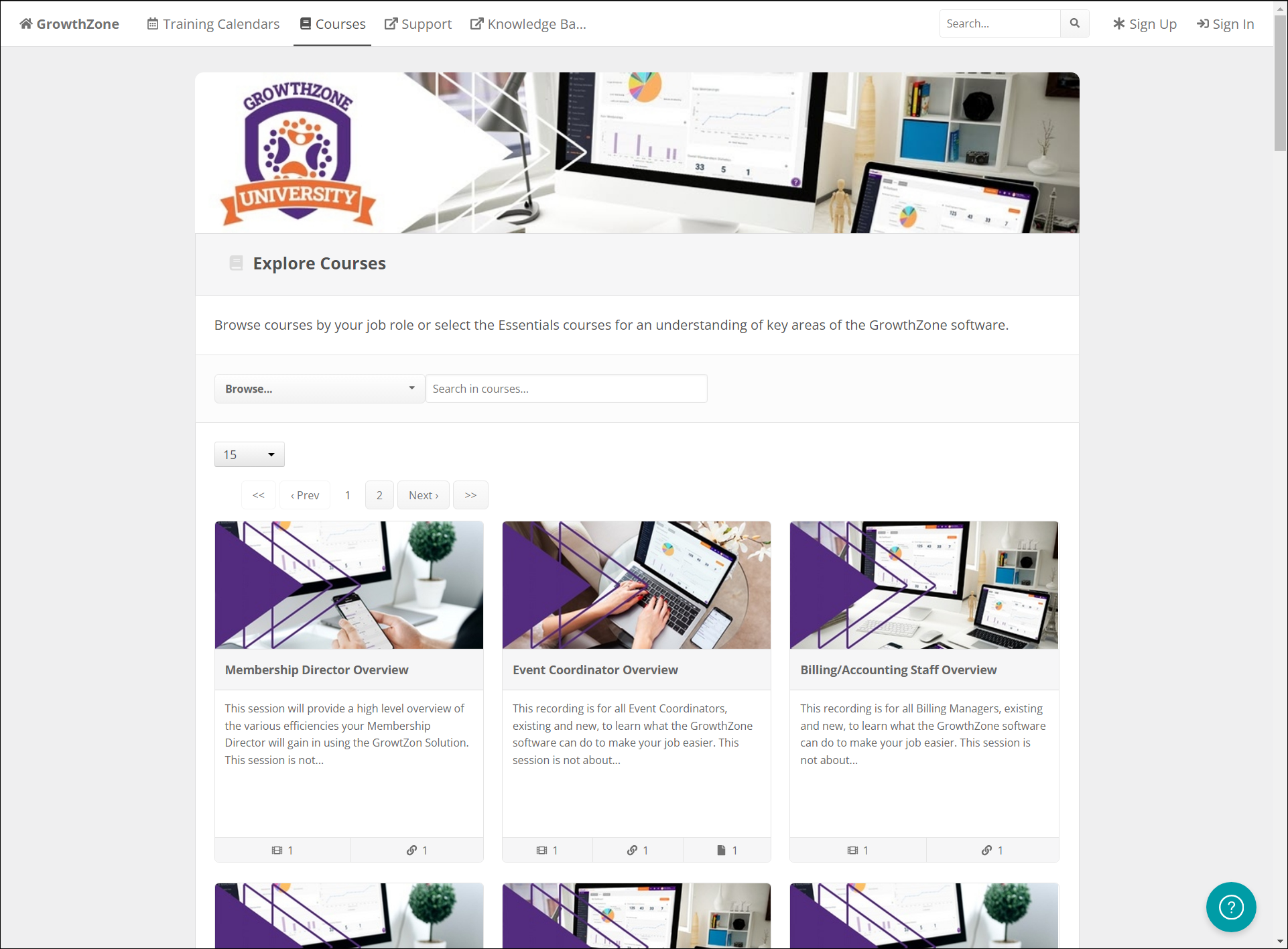 The GrowthZone University home page displays graphical links to various courses and course series, such as GrowthZone Essentials series and several role-based courses, as well as a header bar with links to additional resources.