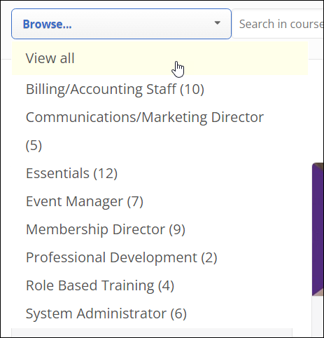 Browse... This dropdown displays a list of categories to select, with the number of courses available in each. Click a category to view all courses available for that category.