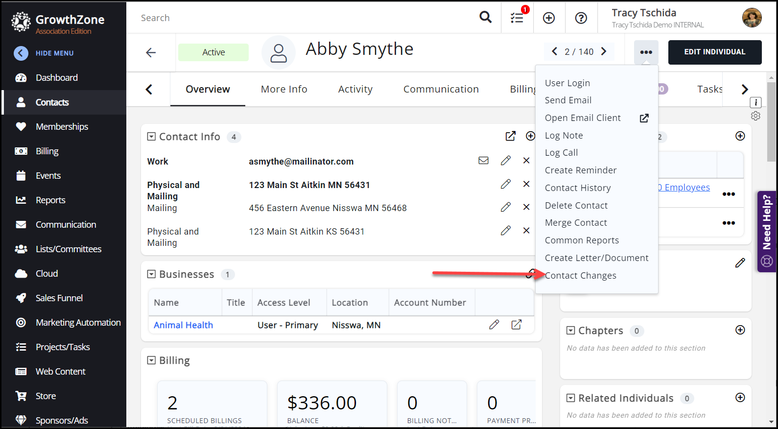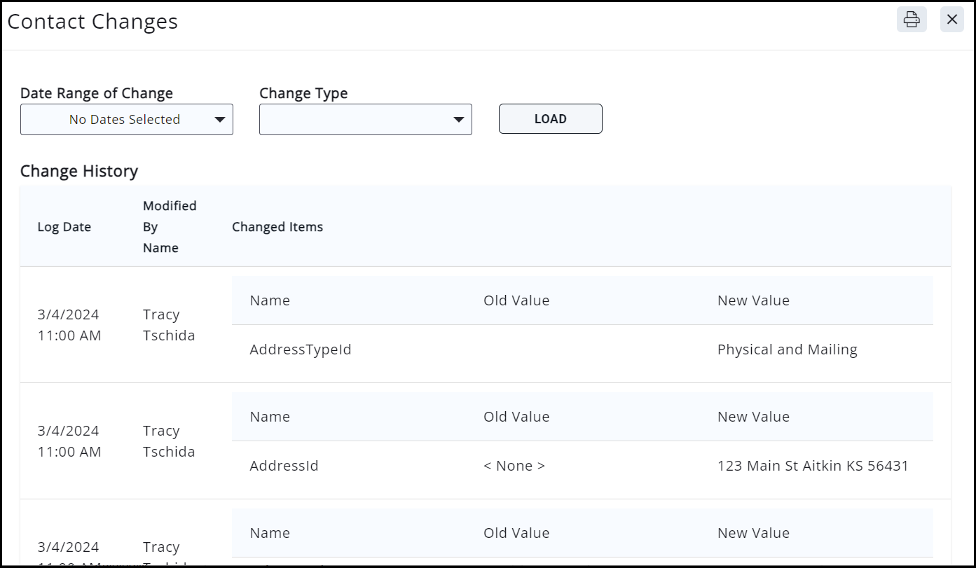 For individual contacts you will be able to review any change(s) that have been made to the Contact Info (Profile tab) and who made the change(s):