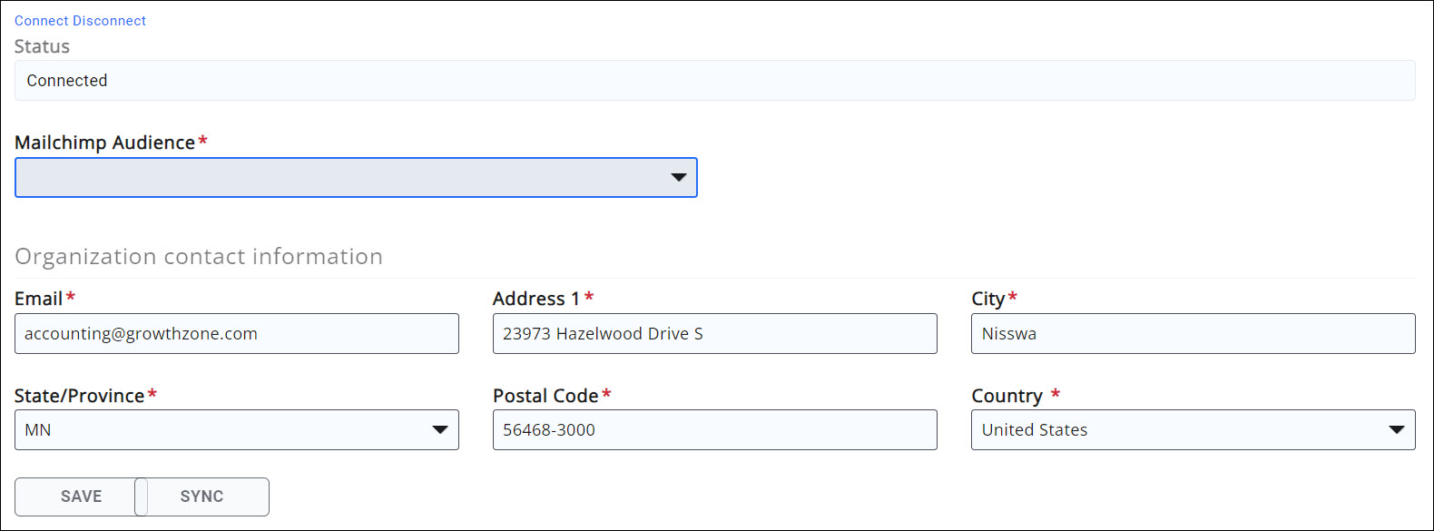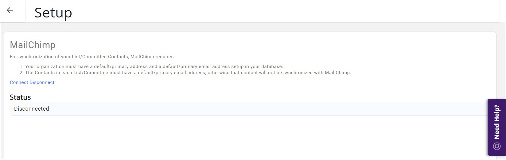 After initial connection, click the Sync button. This will synchronize all of your existing lists/committees, that are set to you Synchronize Contacts with authorized third party newsletter solution, with Mail Chimp. NOTE: Only contacts with a default/primary email address and where Do Not Contact is not enabled, will be synchronized to Mail Chimp.