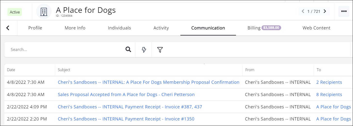 All communications with a contact are logged on the contact's Communications tab. Click the icon to view Delivery Statistics for an email. If a number appears in blue adjacent to an email this indicates that the email contained an attachment.
