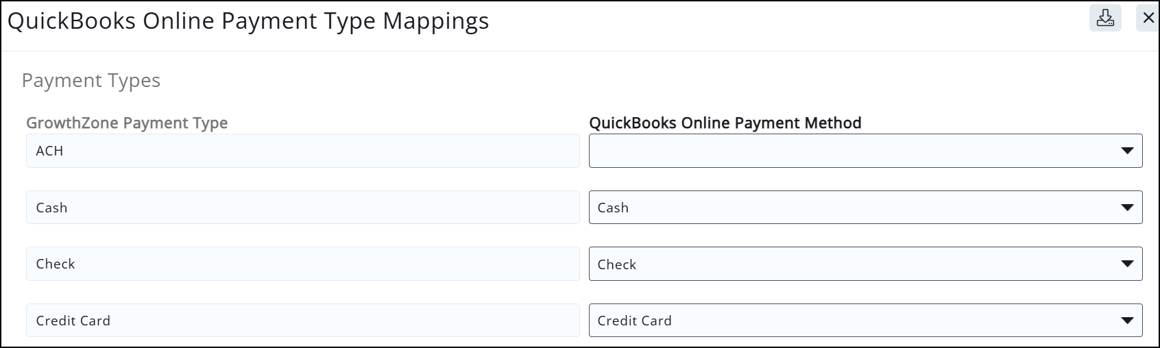 Second, map the payment types in GrowthZone to the Payment Methods in QuickBooks.