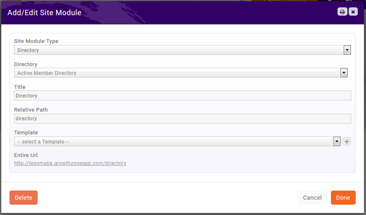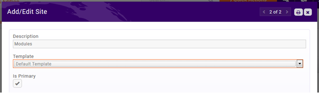 Under the Module Page Settings, click the <No Pages> link or Actions > Modules/Pages then click the orange Add Module button to choose a module to set up. You do not need to select a Template if you have assigned a default template to the site as described in the previous step.