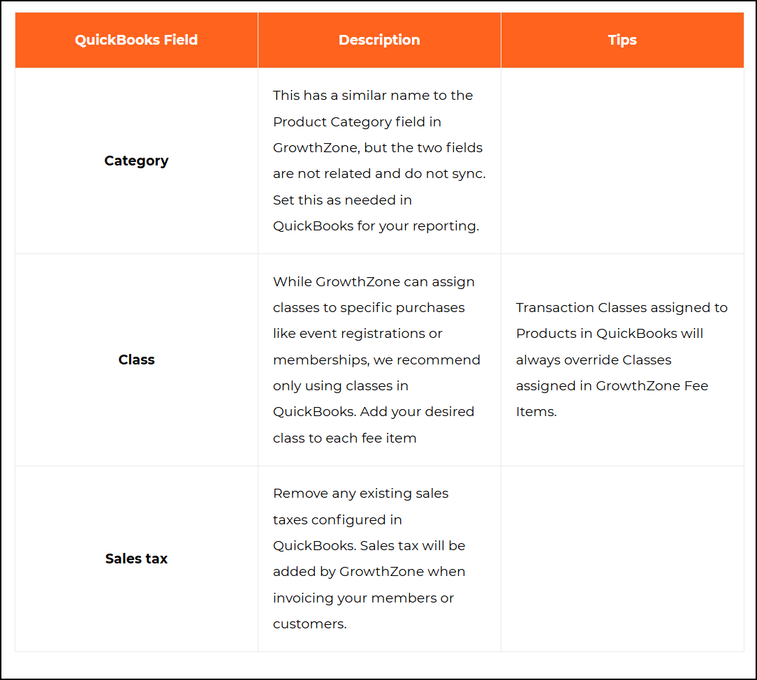 Update settings on products/services in QuickBooks to avoid creating conflicts between GrowthZone and QuickBooks.