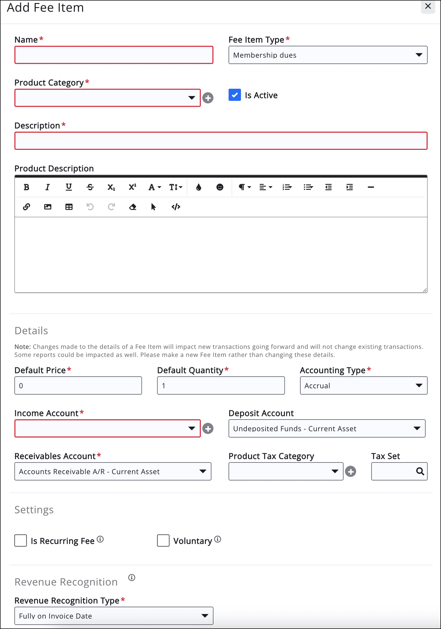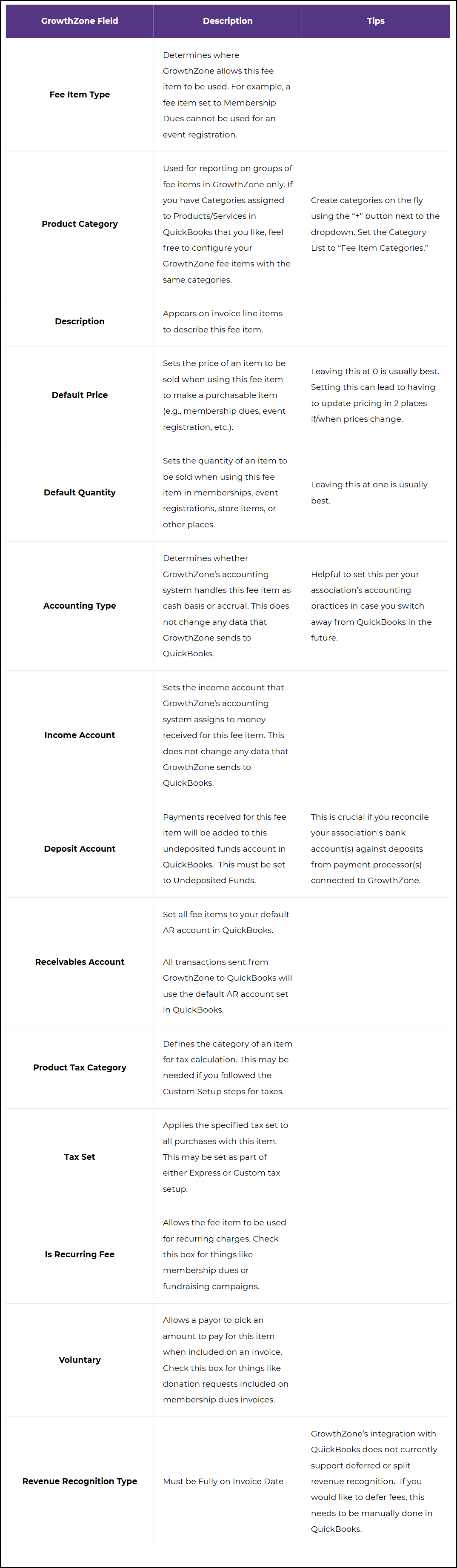 Fee items in GrowthZone will map 1:1 to Products/Services in QuickBooks. The table below describes the fields you will see on a GrowthZone Fee Item.