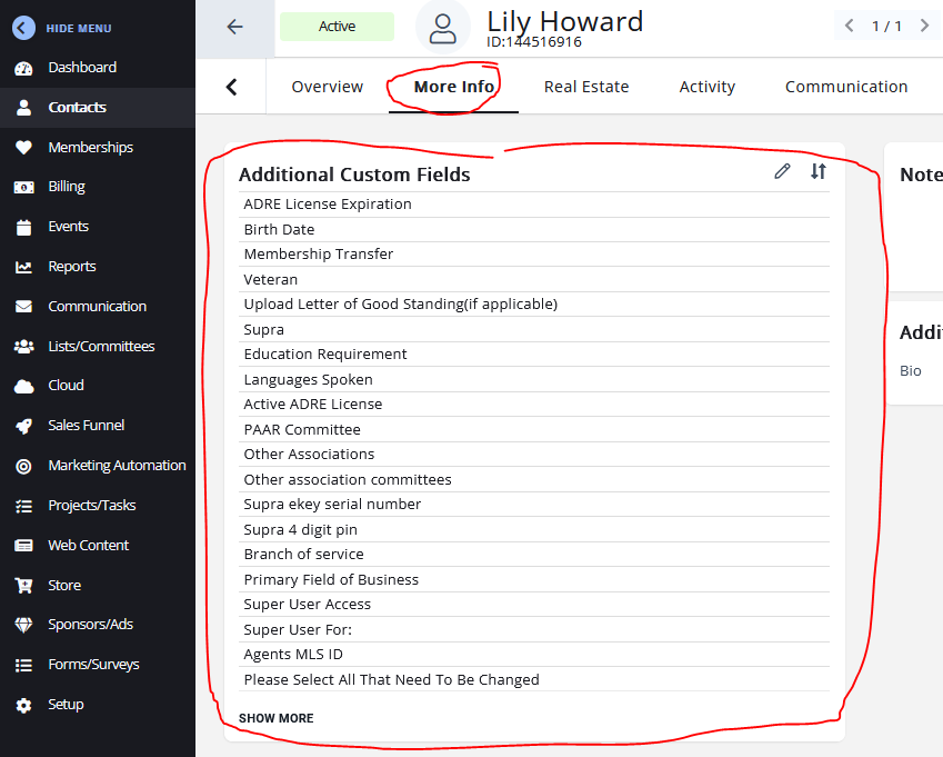 Custom field - This Matches to to the More Info Tab Additional Custom Fields Area - you will need to figure out what the field is using the API