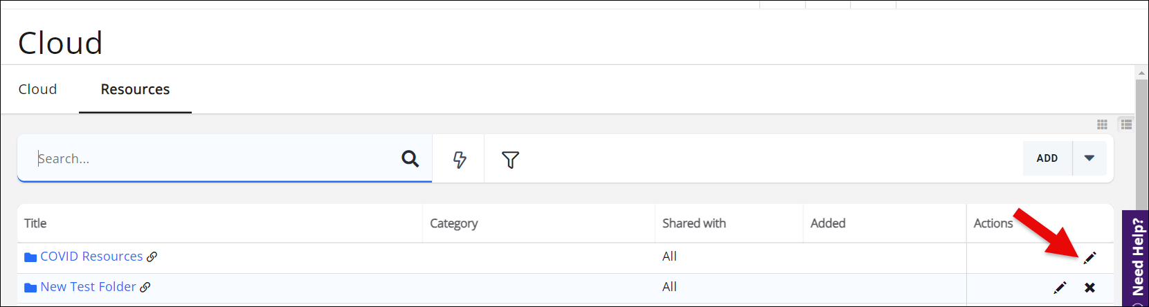 Rename a Resource Folder January 29, 2026 12:45 Updated Click Cloud in the left-hand navigation panel Click the Resources tab Click the icon to edit the desired folder On the Edit screen update the name of the folder Click Done.