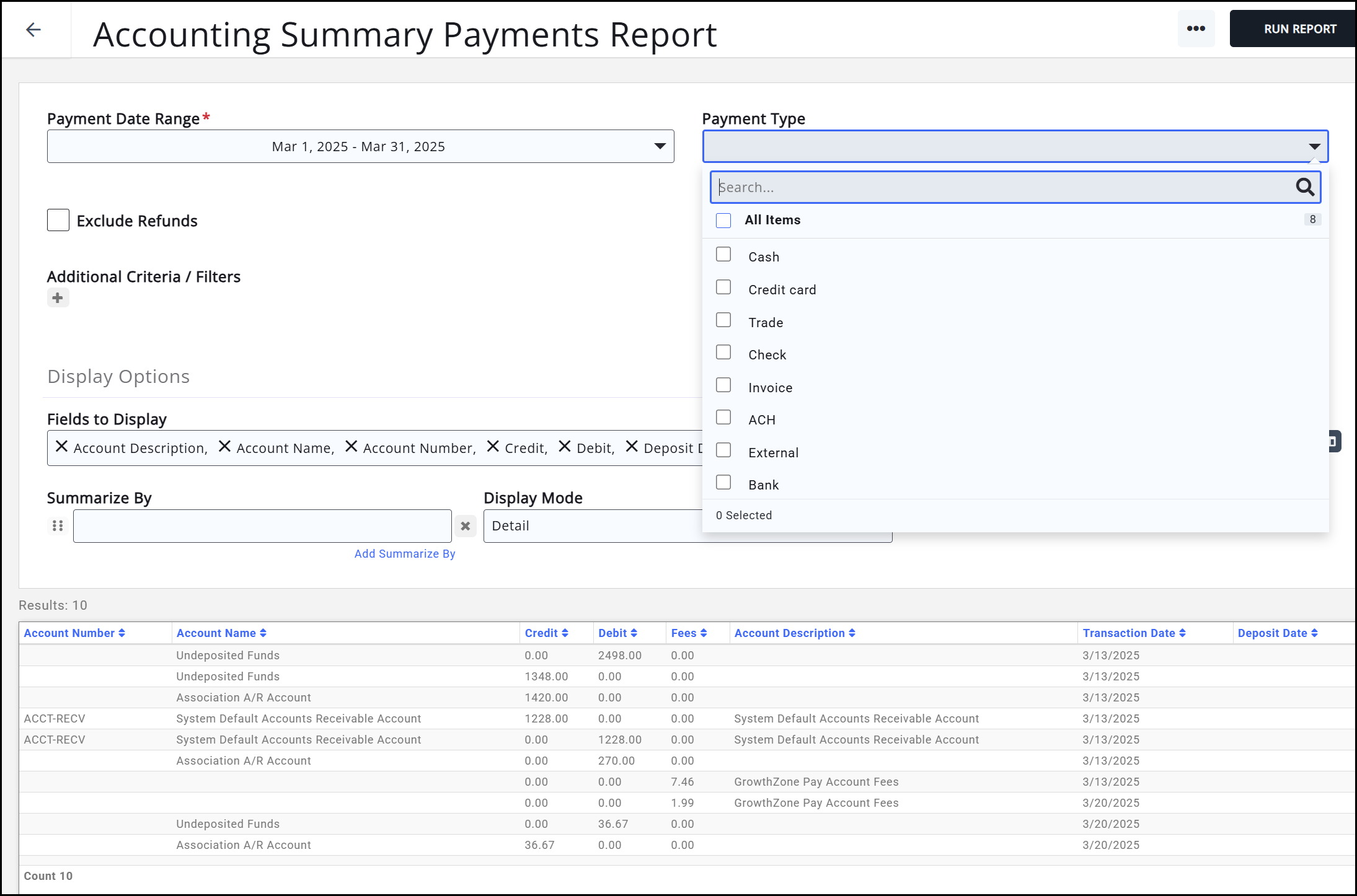 The Accounting Summary Payments report is an excellent report that provides a view of general ledger debits, credits and processing fees associated with payments. Search by date and payment type, and exclude 'Refunds' if you choose.