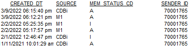 | Kim | Kanner | 176517917 | 3/15/2022 | The MemberStatus must be either A, S, or P. | |