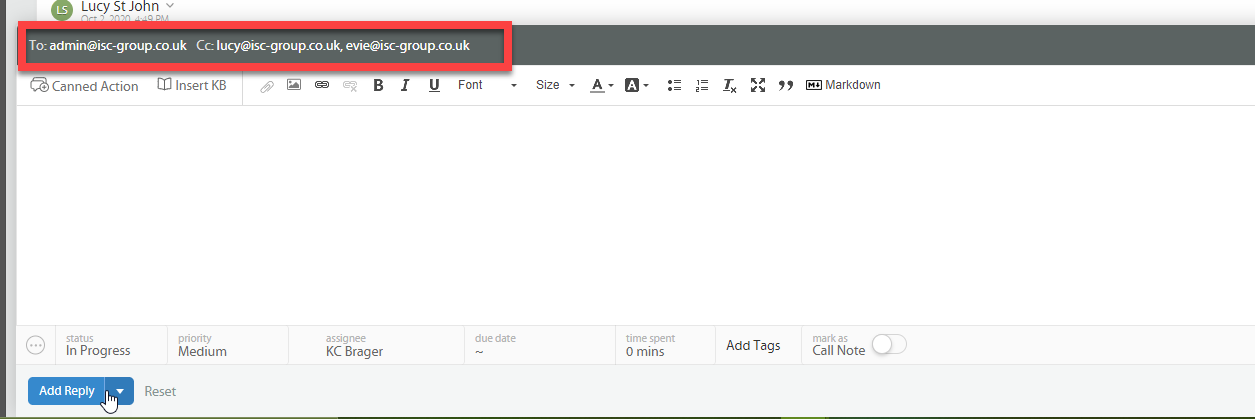 There are times when another contact needs to be added to a ticket, these instructions allow you to add additional contacts to the CC & BCC lines without sending a new message to the customer.