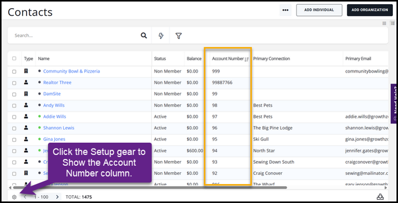 Note: The column title will use custom terminology for the Account Number if entered. To find this option, go to Setup, then System Terminology.