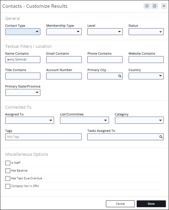 - Name of Contact/Project/Event (starts with or contains)