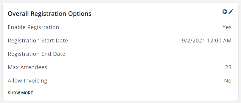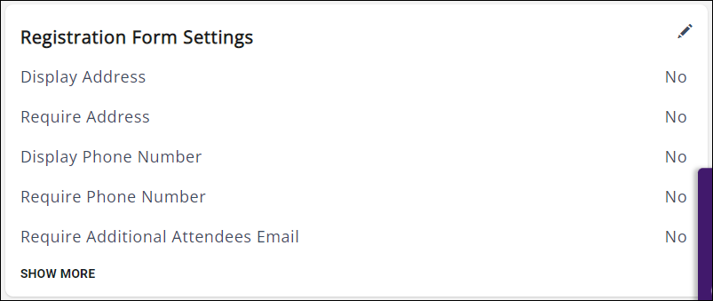 These options control what information is gathered in an attendee registration. Click the pencil icon to edit; click "Show More" to display the full list of options.