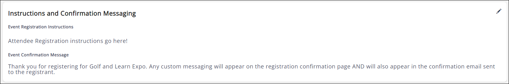 This section allows you to customize registration instructions and the confirmation messaging after an attendee has completed registrations. (The Event Confirmation Message is also included in the confirmation email the attendee will receive.) Click the pencil icon to edit.