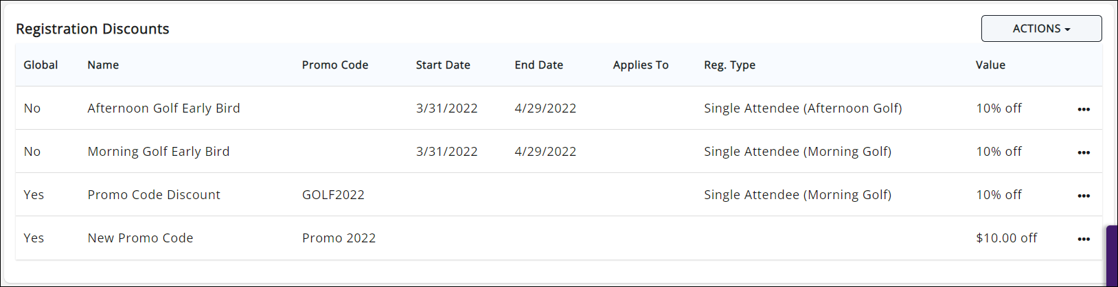 To add a new registration type, click "Actions" and select the appropriate registration type.